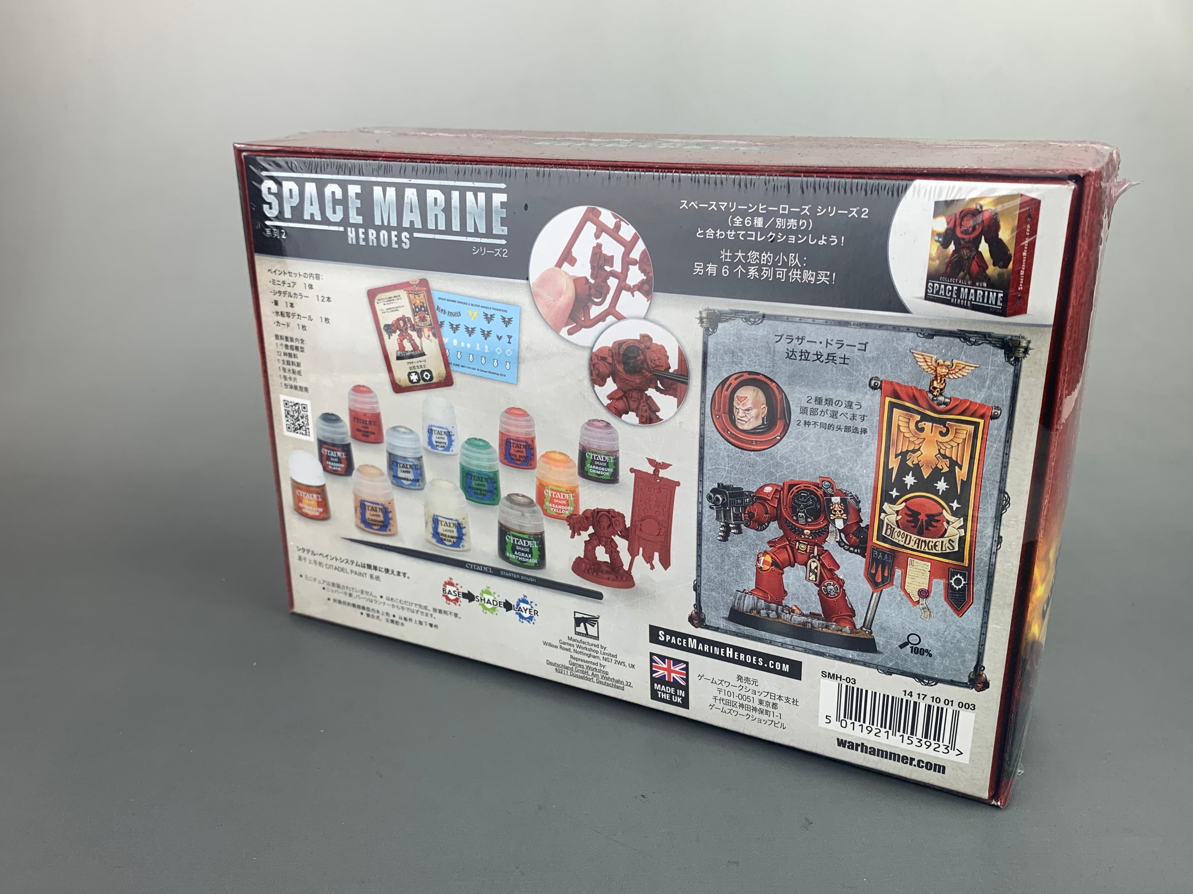 内容物は大迫力のペナントを片手にストームボルターを構えたミニチュア(ブラザー・ドラーゴ)、シタデルカラー12色、筆、SMHシリーズ2のキャラクター紹介と塗装のハウツーを収録したブックレット(フルカラー16ページ)、キャラクターカード、水転写式デカールと大ボリューム。